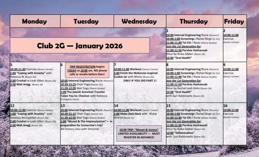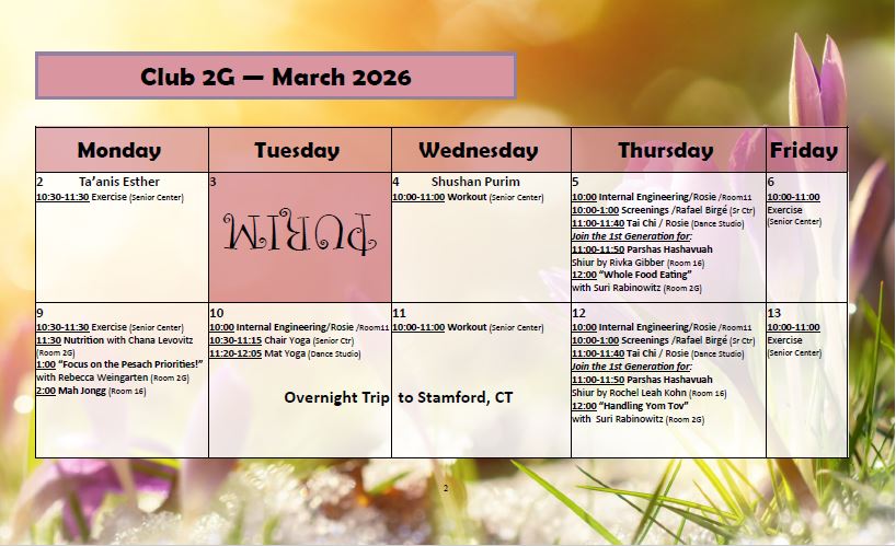 Club 2G is a recreational day program for sons and daughters of Jewish Holocaust Survivors, aimed at providing meaningful and fun activities, peer socialization, and emotional support. As our members can attest, growing up in a Holocaust Survivor household carries with it certain challenges that we wish to acknowledge and validate. In that vein we also offer psycho-educational programs and one-on-one support with trained professionals. See โServicesโ above for more details, and โHow to registerโ if you are interested in membership.